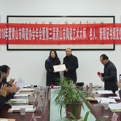 • 提升协会素质,凝聚各种力量状大协会发展,2018年我会又有2名陶瓷艺术家被省经信委、安徽省工艺美术促进会评为省工艺美术大师,有3名被评为省工艺美术名人,到目前为止,我会共有省工艺美术大师 7 名,这是我会宝贵财富和技术力量。在协会发展的这几年中,我会很多大师和艺术家创办了各自的企业和工作室,如祁韵堂、徽艺堂、松梅画苑、瓷迷画廊、掁峰陶瓷、亚文陶艺以及大师工作室等。这些企业和工作室在2018年都发挥了各自的优势,取得了良好的社会效益和经济效益,他们把个人的发展与协会的发展有机结合,成为了我会会员相互交流的佳场所,这也是陶瓷协会发展的推动力量,协会将发挥应有的组织作用,对这些企业和艺术家们开拓市场,研发新产品做好协调和服务工作,进一步促进协会和黄山市陶瓷事业的发展。